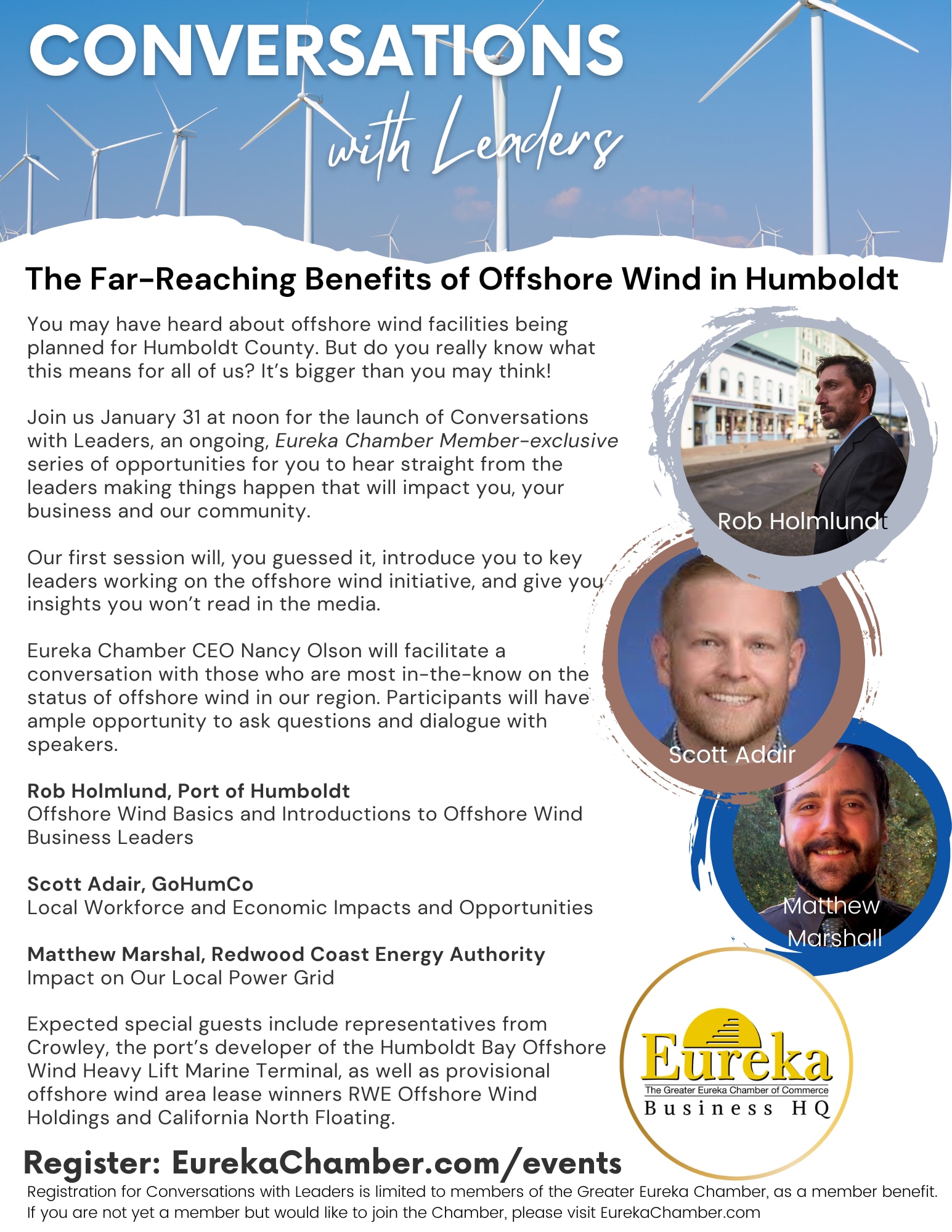 Join us January 31 at noon for the launch of Conversations with Leaders, an ongoing, Eureka Chamber Member-exclusive series of opportunities for you to hear straight from the leaders making things happen that will impact you, your business and our community. Eureka Chamber CEO, Nancy Olson will facilitate a conversation with those who are most in-the-know on the status of offshore wind in our region. Participants will have ample opportunity to ask questions and dialogue with speakers, Rob Holmlund, Port of Humboldt; Scott Adair, GoHumCo; and Matthew Marshal, Redwood Coast Energy Authority. Expected special guests include representatives from Crowley, the port’s developer of the Humboldt Bay Offshore Wind Heavy Lift Marine Terminal, as well as provisional offshore wind area lease winners RWE Offshore Wind Holdings and California North Floating.Images