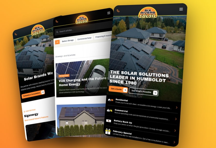 We build exceptional websites that generate more money for our clients, and support their ongoing needs with digital content, marketing collateral, and video production — acting as a full creative department for businesses too busy to manage their own digital presence. One of our clients, Six Rivers Solar, tripled their organic traffic in six months and saw a 68% increase in qualified leads after we rebuilt their site. If that sounds like something you've been putting off, we'd love to do a free audit of your website — no cost, no obligation.